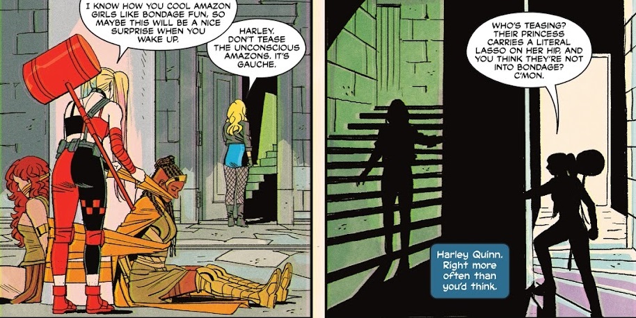 Not as meaty an issue as the past two, but that’s fine. We’re well and truly into the story now, and this remains a fun comic. My only real complaint is that Harley Quinn talks way way way too much. I get that that’s her thing, but it’s crowding out every other character in this comic, including Black Canary. There are a lot of fun characters on this team, and they get some small scenes in which to show off. But Harley’s constant talking really crowds them out. Even when they split up and aren’t on page together, Harley still hogs the spotlight all the time.