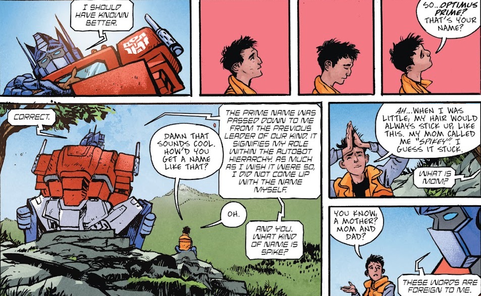 My feeling remains from the first issue that this isn’t anything truly unique or special. It’s the standard Transformers characters doing standard Transformers things. It’s new to me, because I haven’t read any other Transformers comics, but I still feel like this isn’t very new or original overall. It’s just the Transformers doing Transformers things. But I will do my best to put that train of thought behind me, because it’s not fair to review this comic from that lens. How is this comic on its own? It’s good! The characters are really coming into their own, and time is being taken to stop and smell the roses. I very much enjoyed the scene where Optimus and Spike just sit down and talk to one another.