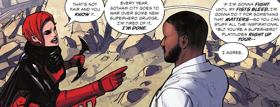 Luke Fox and his dad have put together a new Outsiders organization. They’re using all of Bruce Wayne’s money to fund a new expedition force to investigate strange anomalies around the world. He recruits Batwoman and takes her to Antarctica, where they hook up with The Drummer to go beneath the ice to investigate a 50-mile-long mysterious structure that’s about to blow. They go deeper and find out that it’s a sentient multiversal spaceship. Luke talks it down from exploding and gets it to free all the scientists they’d sent down first. The mission is pretty much a success and now they’re ready to go find more wild stuff.