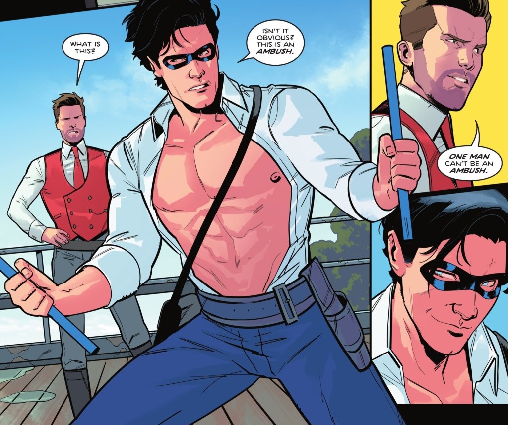 Bea has been stabbed with a sword and thrown off a castle into the water down below, so Nightwing dives after her and saves her. He uses first aid techniques learned from Alfred to patch her up and then they head to the Hold to prepare an ambush for when Dirk arrives. Nightwing is the tip of the spear and beats up most of Dirk’s crew, while Bea rescues her own crew from the brig. They capture Dirk and the day is saved.
