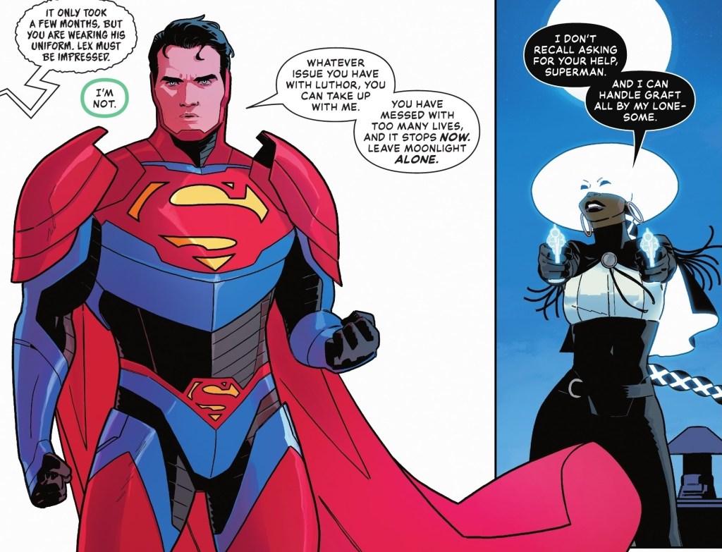 Superman took a bunch of Kryptonite last issue, and he’s in Supercorp resting up with a dose of sunlight. Lois is there reading him Get Well cards from the citizens. Lex is back in prison. The Chained is locked up. And Lena Luthor got a job at Supercorp. Superman eventually comes to and has figured out Graft’s next target: Marilyn Moonlight. He dons a power suit that Lex made for him and interrupts a meeting between Marilyn and Graft, who was trying to recruit her (though she’s not a fan). Graft turns their wheelchair into a battle engine and there’s a brief fight before Graft shoots Marilyn with one of his kryptonite beams and both she and Superman disappear in a flash of light.