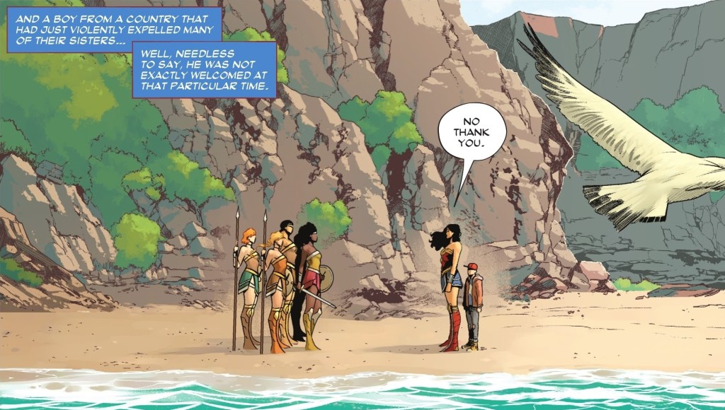 It’s just such a powerful juxtaposition and it works so damn well for how this series has been going. The stakes couldn’t be bigger, and the comic succeeds with making those stakes feel real and feel important. And then it succeeds with making Wonder Woman this larger-than-life figure at the center of it. I cannot stress enough how almost other-wordly she comes off in this series and this issue in particular. She’s truly a larger-than-life figure, casually brushing off the unjustified anger being hurled at her, and unflinchingly standing up for the boy and what’s right. It’s powerful stuff, and really makes this comic something special. The artwork, likewise, doesn’t miss a beat in making this character as magnificent as she has ever been on the page.