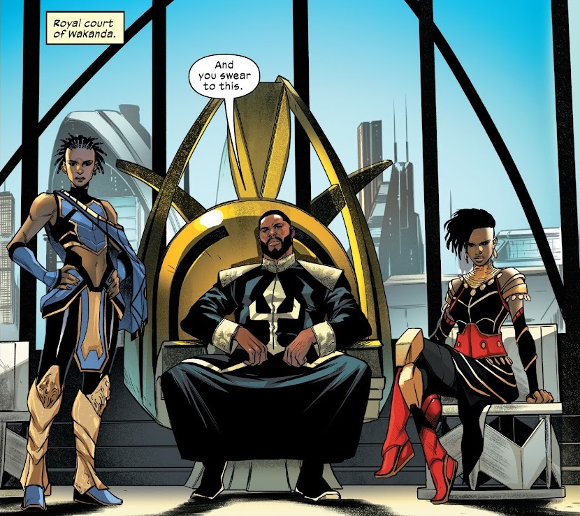 In the new Ultimate Universe, the gods Ra and Khonshu rule Africa, and now that the Maker is gone, they’ve started using their Moon Knight soldiers to slaughter innocent people. Word of this is brought to King T’Challa of Wakanda, which is still a secret city, and he would rather gather intel than act. This annoys his sister, Shui, while his common law wife, Okoye, believes he is right. Then at a big celebration, a member of his inner circle declares herself with Moon Knights and suicide bombs T’Challa’s dad. So now he’s ready to go to war.