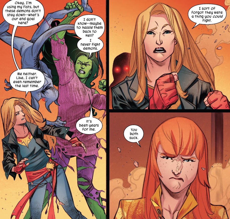 She-Hulk, Pasty Walker and Captain Marvel fight a bunch of demons until Patsy’s ex, Daimon Hellstrom, shows up to round them up back to Hell and leave her a little emotionally wounded (he didn’t cause this). The women commiserate and banter, and Jen tells Carol she’ll think about the offer to join the Avengers. When Jen gets home, she and Jack talk about when he died and when she went crazy and they put that past behind them quickly.