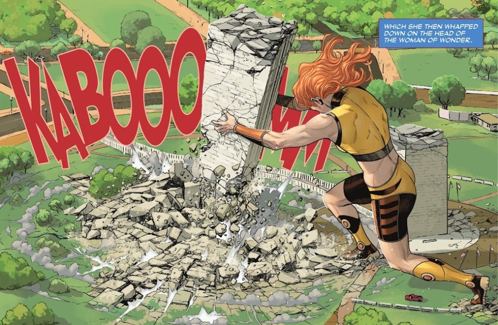 And then connect that strong tone with an all-out action issue, where Wonder Woman takes on some of her greatest rogues in a brawl to end all brawls. I didn’t spoil this in the recap, but I will here: Giganta smashes Wonder Woman with the Washington Monument!