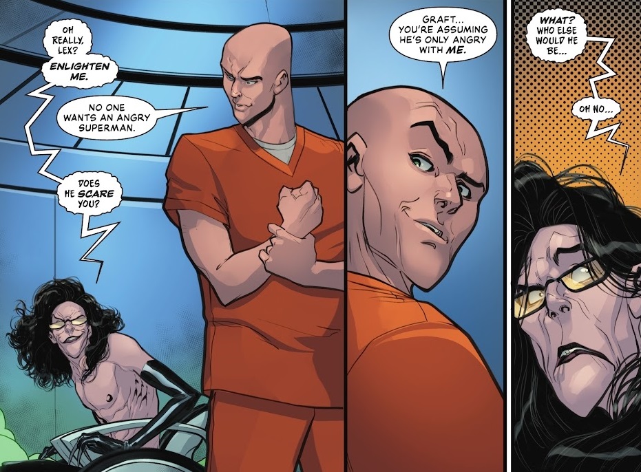 Superman is face-to-face with the Lex Luthor Revenge Squad, comprised of Pharm, Graft, The Chained and a surprise member: Leticia Luthor, Lex’s mother! They’ve synthesized and enhanced all the different Kryptonites, and Graft uses Red Kryptonite to make Superman angry enough to join them, and break Lex out of prison. But Graft didn’t anticipate that an angry Superman is angry at a lot more people than just Lex, and he attacks everybody. Lex stabs Superman with some Green Kryptonite to negate the effects of the Red, and that weakens Superman just in time for Graft to unleash their most diabolical plan: cover the city in Kryptonite gas that has been enhanced to kill all humans! And it’s a plan that Lex cooked up years ago, when he worked with Pharm and Graft!