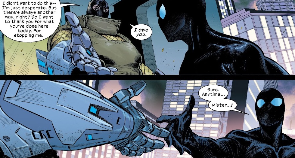 Basically, you’ve got a 30+ year-old Peter Parker who has just now gotten spider powers essentially out of a can, so he’s not bothered by guilt or any great need to do anything but swing around and get used to his powers. And that’s a fun Peter Parker to read. He comes up against a bad guy and assumes he’s got to stop him from committing crimes, and Hickman writes some pretty funny scenes between Peter and the Shocker. Hickman obviously knows how to write comic book characters, and he does a great job throughout the issue. Those two scenes just really stand out as quite excellent.