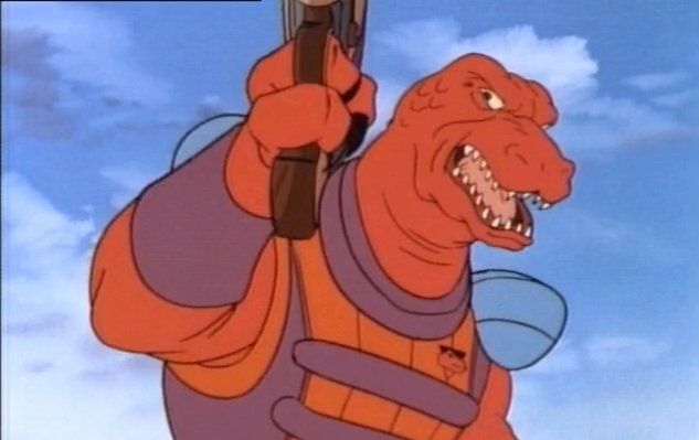 It’s entirely possible that nobody but me remembers the cartoon show Dinosaucers, one of a bajillion little shows that came at the tail-end of the 80s toy commercial cartoon craze. Were there ever Dinosaucer toys? I don’t know. It was about aliens who came to Earth and were humanoid dinosaurs, but they had the ability to transform back into regular dinosaurs. Genghis Rex was the leader of the bad guys, and each team had a diverse array of dinosaurs. Man, that show was pretty neat.