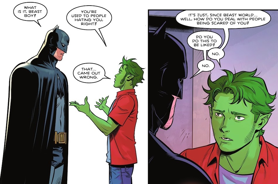 This was a very good follow up to the previous issue, with plenty of solid Dick and Bruce moments to appease a fan like me. Longtime readers of my reviews will know that I’m a sucker for good Batman and Robin content like this, and Tom Taylor seems to love it just as much as me. So yeah, great stuff in this issue, including a nice scene of Batman interacting with Beast Boy as well. It very much has the energy of a dad interacting with his son’s friends, while simultaneously being elder statesman Batman interacting with a younger generation superhero. Very nicely done.