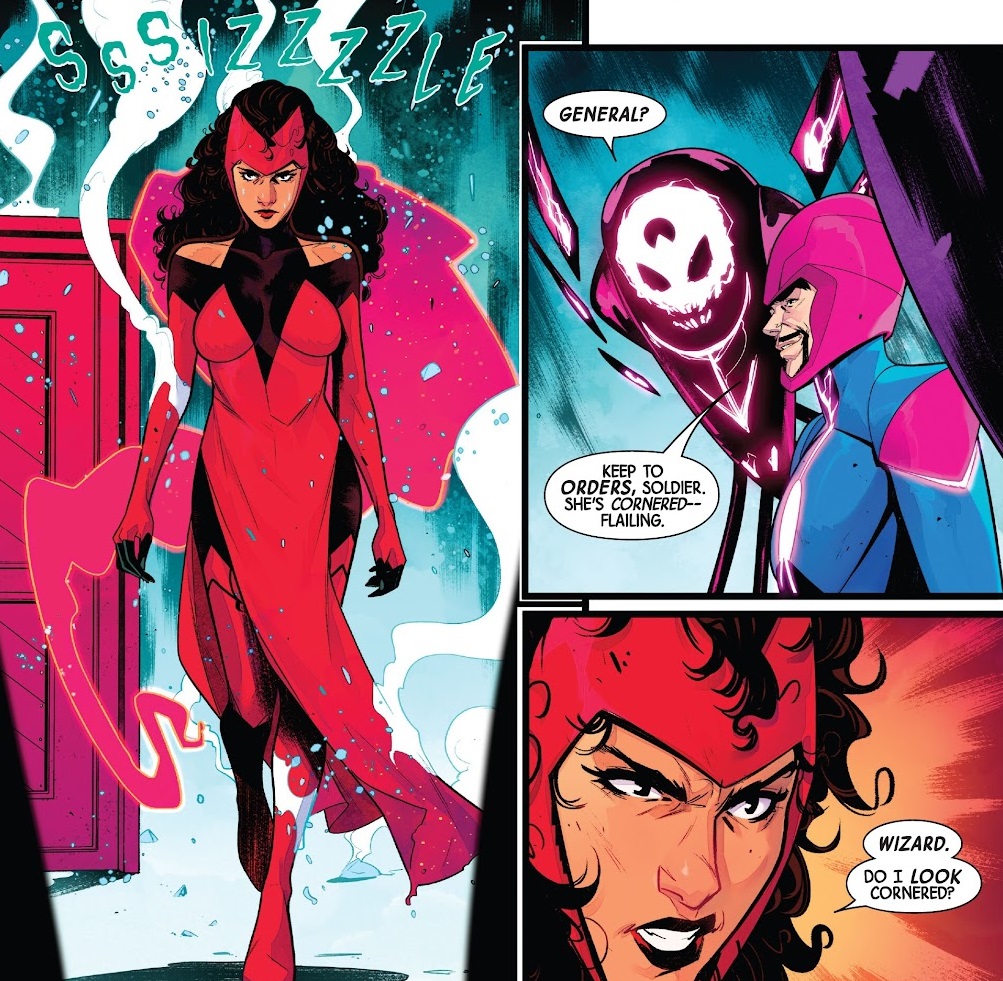 I think the artwork is a real standout in this series so far. Everything is so crisp, clean and colorful. That’s what I really love in comic book art. And then the colors really, really pop! The Wizard and his henchmen are rocking some really great, really popping purples. And who doesn’t love a good villain design? Obviously Wanda’s outfit has looked great since issue #1. I’m not the biggest fan of Quicksilver in green (gimme light blue!), but it’s still a popping color. So the series is already killing it on artwork.