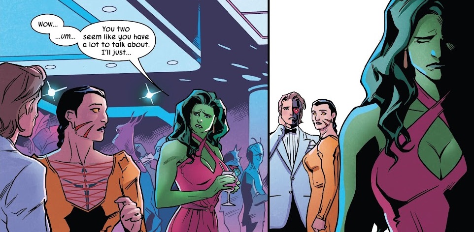 When She-Hulk sees that Ganymede and Jack of Hearts clearly have a history, she runs away crying. Jack checks in with her and Jen tells him to go spend time with Ganymede while she heads home — but she can’t, because her car has been impounded. So she’s stuck just wallowing in misery in the hotel. Jack and Ganymede have a little heart-to-heart, and he does absolutely nothing to point out to her that he’s with Jen now. Ganymede is actually at the resort for a job interview to lead the horde of Drapurg, who wants vengeance against the Earth woman who stopped his horde. Ganymede takes the job, then later learns that Earth woman is She-Hulk!