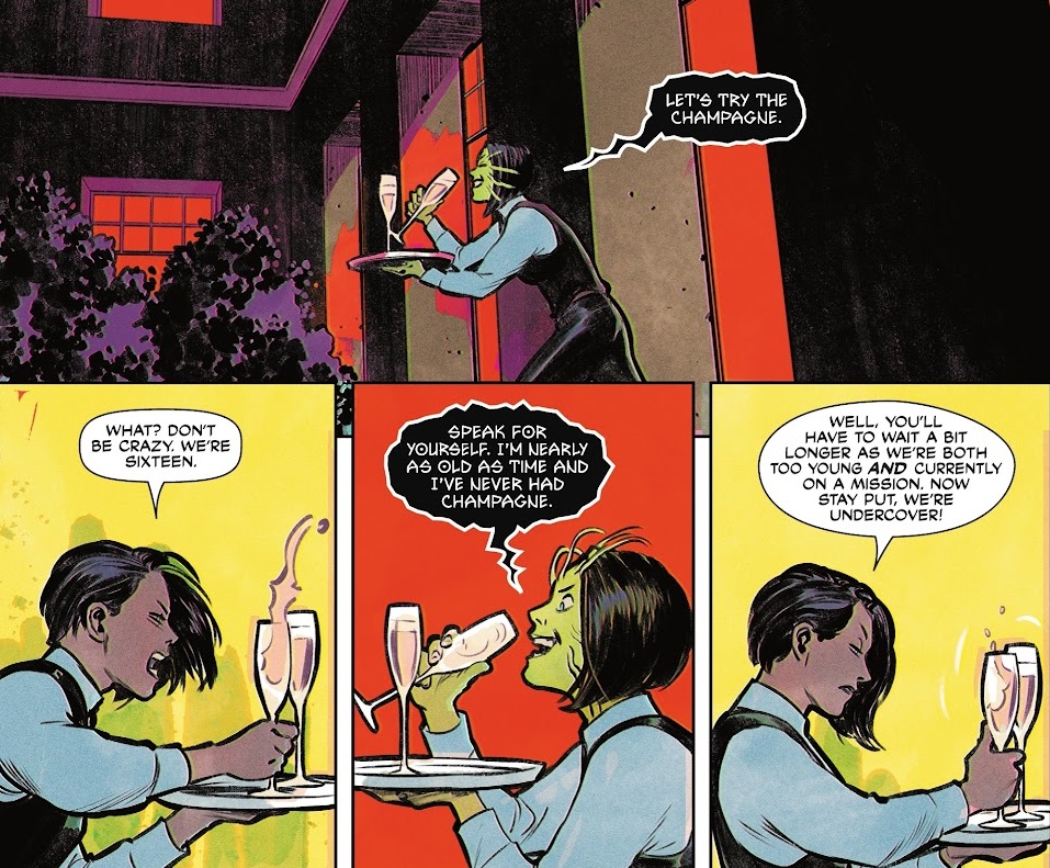 Birds of Prey is a really fun, really engaging team book that makes great use of all its characters. Everybody is just fun. And Thompson clearly knows how to have fun with her characters. A cheesecake and beefcake fight scene? with Big Barda stripping naked, her bits carefully covered by action and Hawkeye callbacks? What’s not to enjoy? It’s good, clean comic book fun, with a solid art team keeping the momentum going. The characters are all a hoot. Sin and her new ‘sidekick’ get a lot of focus this issue, as they work undercover as a waitress at the shin dig. That’s a blast, seeing the two of them interact. The jokes are good, the characters are fun; it’s a good comic.
