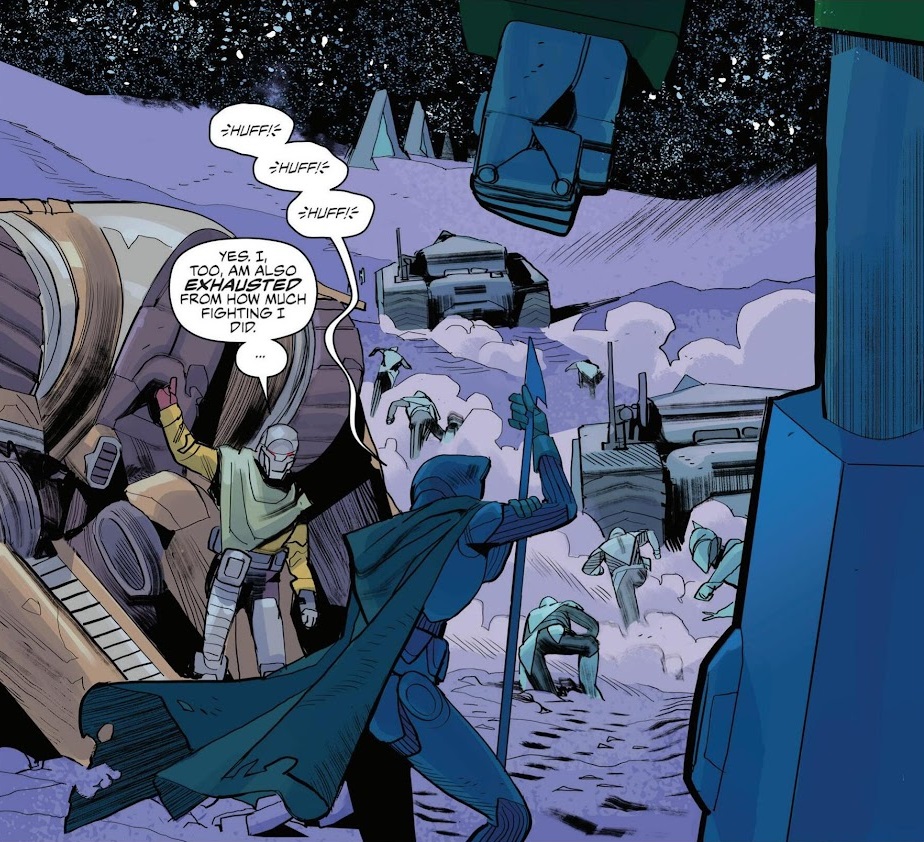 First of all, apologies for the vagueness of that last sentence in the recap. I’m losing track of what’s happening with all the other characters in this comic. I still very much enjoy the Skuxxoid, but I’ve lost track of the other players. And then Rodimus Prime shows up out of the blue (at least I think that’s who it is). So all of the mini story chapters at the end of the issue were more confusing than anything else. But the fight with our main characters was a real hoot! Kirkman was in solid form with the banter and the humor because Darak is terrible in a fight, it seems; hilariously so.