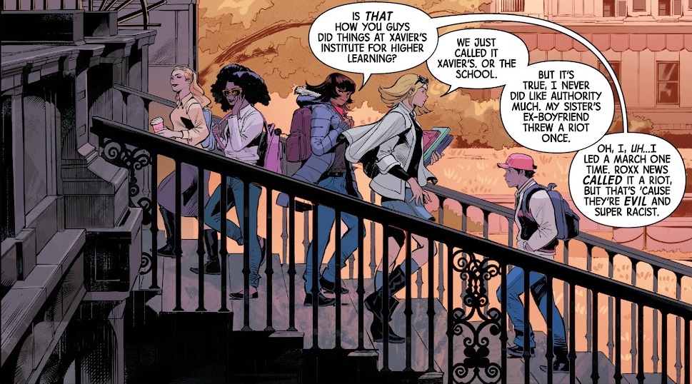 This issue has a fresh, unique feel in terms of a new team book, and that is its biggest strength. The focus here is clearly on these characters as young adults making their way in New York City. Some story elements are a bit of a stretch, like getting Kamala into NYC or Sophie immediately just grabbing her socially and never letting go, but such are the needs of getting the story going. I can easily forgive that because the characters are written so well, their dialogue moves nicely and I like them as people. And the characters interacting well is going to be the heart of this team book, hopefully. One thing Krakoa got wrong was always being plot or story based and rarely character based.