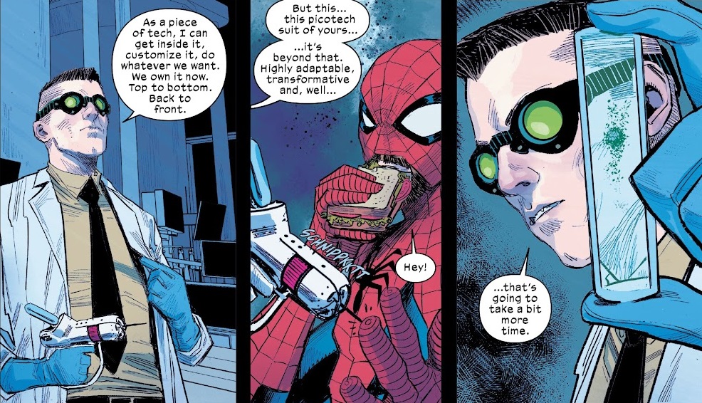 Harry has recruited Oscorp scientist Otto Octavius to look over both the Green Goblin and Spider-Man suits. They’re both Stark Tech, and Otto discovers that they’re also both running in safe mode, that there are a ton of other features they can unlock. Chief among them is the onboard A.I. partner. Peter wants his AI to just be himself, while Harry chooses his dad. They spar and try out these new gimmicks, and then Iron Lad shows up at the end to recruit Spidey to the Ultimates.