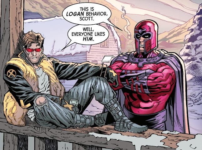 Meanwhile, in the flashback, we see Magneto visit Cyclops at his family cabin in Alaska as they commiserate the end of Krakoa and what to do next. Then the giant sentinel erupts from the factory and they rush in to save the town. In the process, Magneto loses control of his powers, and it’s determined to be a resurrection-linked degenerative disease, so that’s why he’s always in a floating wheelchair.
