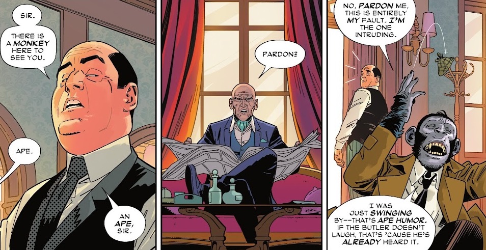 I’m loving this part of the ongoing story as much as I have the rest! I love how King has laid it out. After murdering her boyfriend, The Sovereign expects Wonder Woman to come at him with all the fury of a woman scorned. He’s ready for that. But he’s a petty misogynist and has no idea what’s coming for him. Wonder Woman is busy with the more important task of raising this new child and introducing her to her grandmother. Meanwhile, she’s sent out her agents to come at Sovereign sideways. Last issue was all about the Wonder Girls taking down his financial holdings. And this issue has Diana sending Detective Chimp to actually investigate the murder like it was a crime. Sovereign expects the superhero fisticuffs after the death of Steve Trevor, but Wonder Woman comes at him like it’s a crime…and uses the wonderful Detective Chimp to get it done.