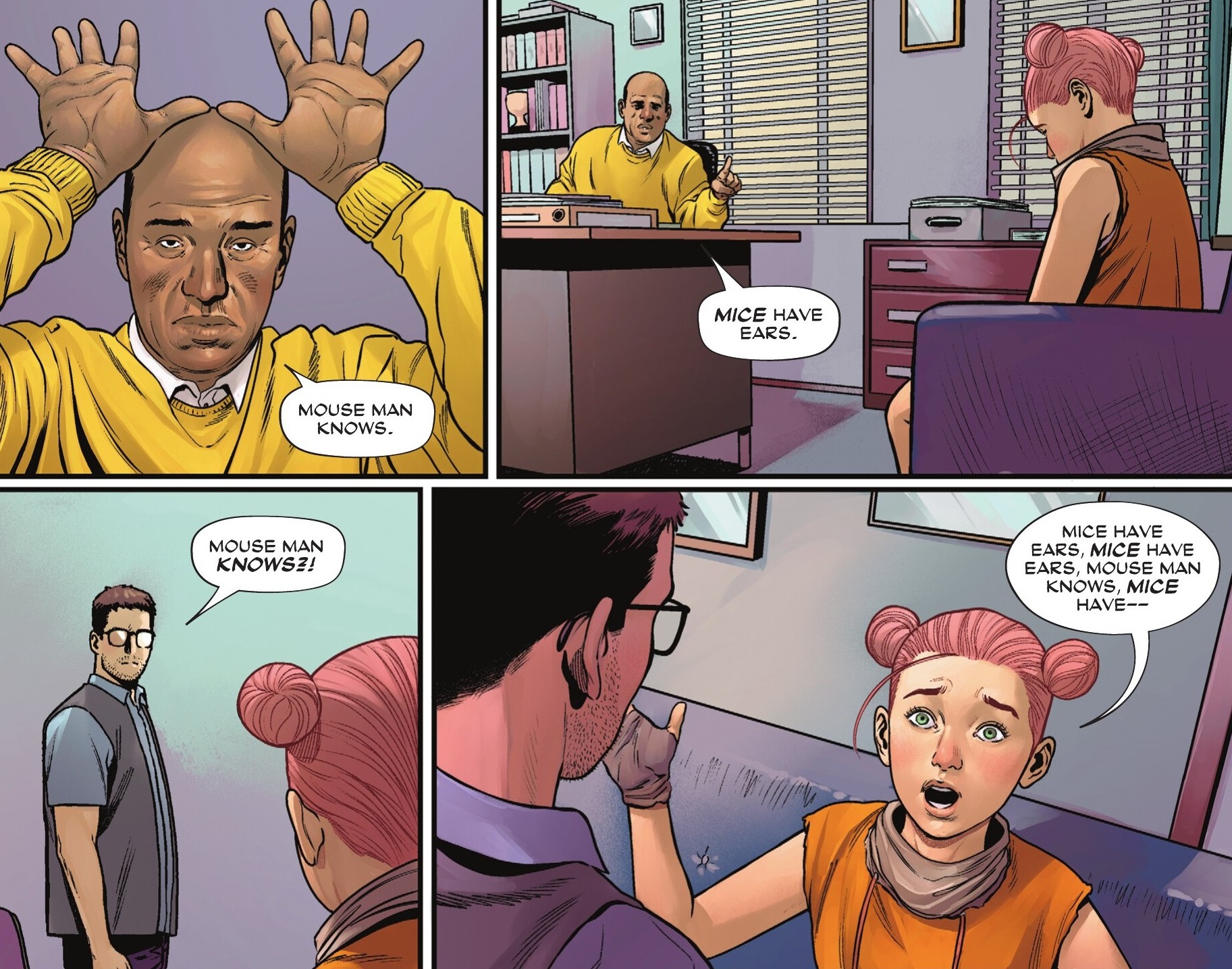 I don’t even know what King is trying to say with this gimmick. There’s no indication by the end of the issue what it’s all about or how it applies to Mouse Man. I guess we could be looking at a complete and utter reinterpretation of Mouse Man, considering he’s barely ever existed to even have canon in the first place. And I’m definitely open to see where this is going. But I needed something this issue to tie it together by the end, to offer even a glimmer of explanation or point. How does the repeated phrasing make the story better than if the characters were just speaking normal dialogue? I’m sure that will be explained (I think it will be explained), but I really needed something in this first issue to ground that level of madness and I didn’t get it. This was all a step too far for this poor lad.