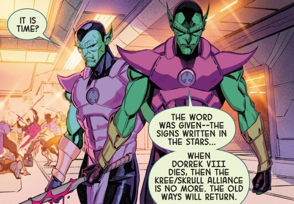 I thought I didn’t care about the cosmic makeup of Marvel in the first issue, but oh how it has sunk in this second issue. This is just one big mishmash of aliens and their spaceships shooting at one another, and then everybody getting double or triple crossed. And none of it feels like it matters. None of it really lines up to a coherent or interesting storyline. Who cares if these various empires collapse or kill each other? They have no greater baring on the Marvel Universe. And they’ll just be replaced at the end of this story anyone. And it seems like they’re just being replaced by the old status quo. The Skrulls are evil again? And the old Shi’ar bad guys are staging a coup? It’s boring!