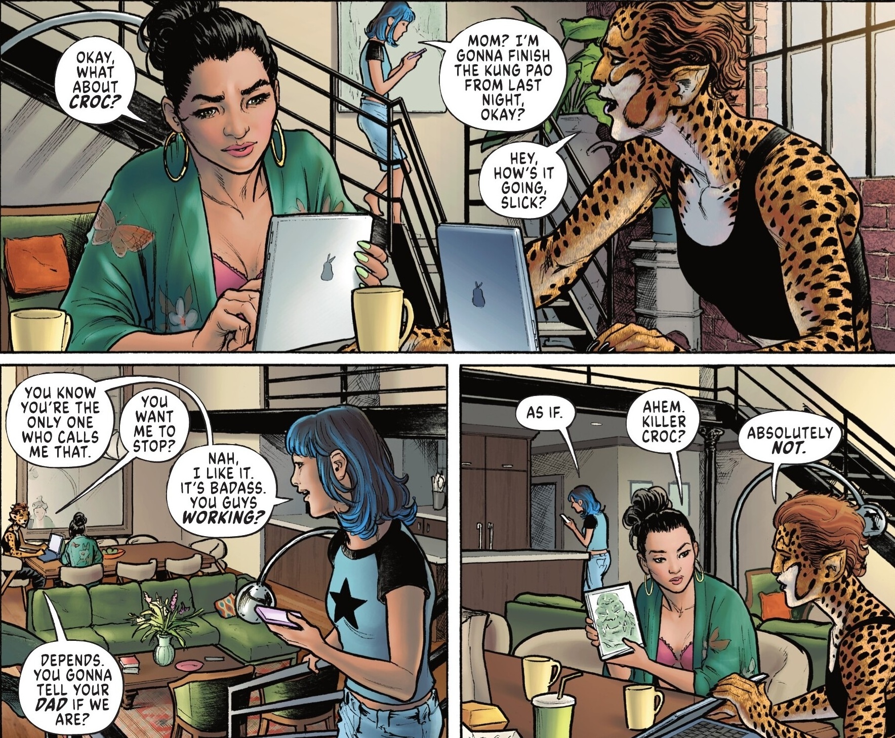 This issue is all about the grounded, human nature of these characters and that sort of thing is like crack to me when reading superhero comics. I want to read about characters who are people first and superheroes second. So I love, love, love scenes where Cheetah and Cheshire are sitting around the breakfast table picking out teammates, and then Cheshire’s daughter Lian comes downstairs and banters with Auntie Cheetah. It’s wonderful.