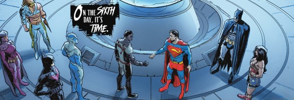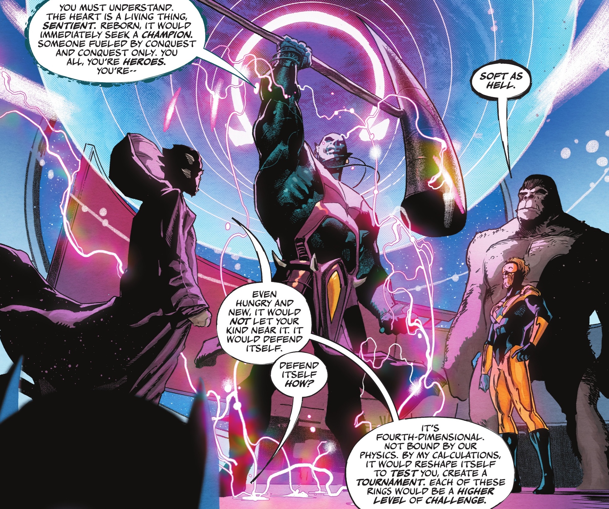 Building upon DC All-In and the Absolute Comics, the next chapter is K.O., where Darkseid arrives on Earth and completely absorbs all existence into his being in seven days. I haven’t been reading all of the lead-up comics, but the Quantum Quorum is a group of time travelers who have come back to warn the Justice League. They all put their heads together and spitball that they can use the Heart of Apokolips that Darkseid put at the center of the Earth to transform one of them into a King Omega to rival Darkseid. And for some reason, the Heart itself is going to going to choose the King by pitting everybody who shows up against each other in a fighting tournament. It’s their only and best idea, so they run with it.