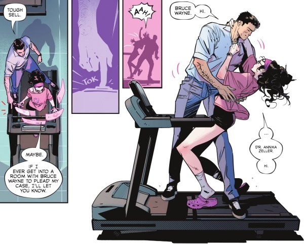 I probably liked the rest of the issue a lot more. Bruce goes to visit his new love interest, that scientist working on the anti-psychotic helmet. They have a really cute scene together. We get a scene of that kid who captured the footage going to the newspaper — though, again, I think Faction just invents a brand new newspaper out of thin air, even given them a Daily Planet-esque building complete with spinning logo on top. That’s a little far-fetched when he could just use the Gotham Gazette and it wouldn’t create any issue. But that’s just nitpicking on my part. It’s still an intriguing storyline to follow as part of the overall tapestry. And we get a little bit of Batman action as he investigates the truck heist gone wrong, which is always fun.