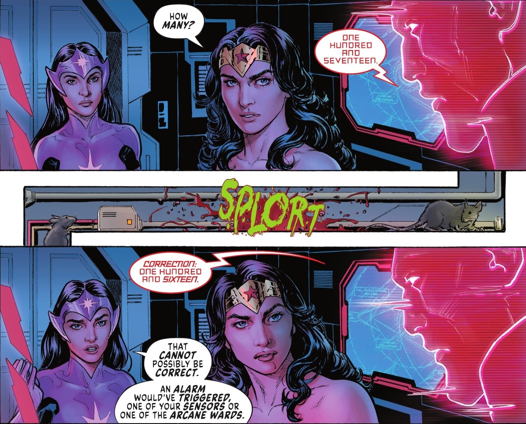 I know I nitpick a lot sometimes, but when a story is this good, nitpicking goes right out the window. Is this the greatest heist plan of all time? I don’t know and I don’t care, because I’m having so much fun with it. Rucka and Scott easily juggle all of their thief characters, as well as all of the Justice League characters, for a lot of controlled and entertaining chaos. There are so many moving pieces, and it all works so fluidly and with such fun. Like the idea of infesting the Watchtower with rats that are primed to explode, so that Red Tornado, the Watchtower’s oversight system, detects an insane amount of unauthorized lifeforms…that then start disappearing. Everybody thinks he’s malfunctioning, but he’s not, and that’s a hoot! And it’s just one example of all the nifty little ideas that comprise this heist. Such a good read.