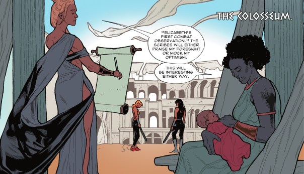 Let me first say, right off the bat, that I’m disappointed that this isn’t just an issue of rest and relaxation for everyone involved. I’ve gone on record as saying I like superhero comics where the characters can just be people. There’s an issue of this comic where Wonder Woman and Superman go to an alien mall to buy Batman a birthday present, and it was a great issue. I wanted an issue where we get a peek into everyday life on Paradise Island, where we see how Diana chooses to relax, all while the Wonder Girls go all Three Women and a Baby with Lizzie. Instead, we get a pretty standard superhero tale that involves a lot of fighting. So that was disappointing.