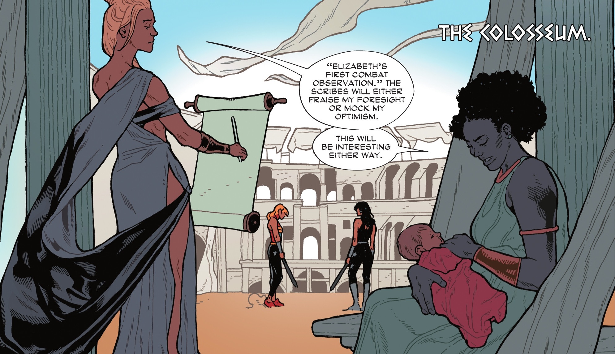Wonder Woman is burnt out and she returns home to Themyscira, where the Amazons and Wonder Girls welcome her and the baby with open arms. They take the kid so Diana can rest, and decide that a sparring session might entertain Lizzie. But the fight turns angry and brutal, so that Queen has to step in to stop the Wonder Girls from killing each other. They’ve all been undone by Eris, the Goddess of Strife!