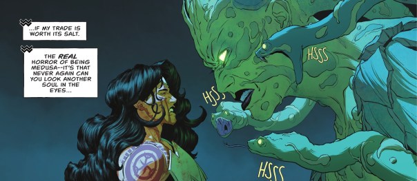 The issue itself is so damn good. We get an opening montage of Wonder Woman saving people around the world, coupled with her repeated prayers to help Medusa. We all know and love Medusa, so seeing Wonder Woman interact with a classic Greek Myth character is super fun! And like I said, De Iulis on artwork was beyond amazing! Medusa looks insanely cool, both huge and hurting, while Diana never waivers in being just as strong a visual character. To say nothing of the action and the quieter moments and the overall just larger-than-life nature of this super entertaining story.