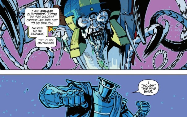 There’s a lot going on in Void Rivals these days, and this issue can’t get to all of it, but what we do see is excellent. The opening scene with Darak doing the rescue is awesome…except for that fact that we don’t really know his squadmates. It’s this random bit of Darak lore that feels like it should be bigger, but just hasn’t played that big a role. Maybe now it will? Whatever, it mostly features some excellent Darak and Handroid action, and that’s fun. But the real juice of this issue is the confrontation between Judge Naven of the Quintessons and Zalilek, who stands up for his people. That’s just a hilarious scene.