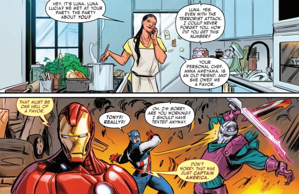 Right up front, I’m a little disappointed at the ‘big reveal’ in this issue. The first issue set up some kind of Tower of Babel situation, as if Iron Man had some very specific plans on how to take down superheroes and Madame Masque got her hands on it. But it turns out, this storyline is built around the vague idea that Tony Stark figures some other super genius might get tested like he did once upon a time, and come up with a bad weapon like the Iron Man armor. On the other hand, it’s not the worst overall villain scheme I’ve ever heard. This story provides us with a bunch of new NPCs who could be turned into ongoing supporting characters, and makes it a bit more personal for Tony himself. I don’t buy into the idea that her’s personally responsible for these geniuses being kidnapped just because they were finalists for his genius award, but I’ll roll with that idea.
