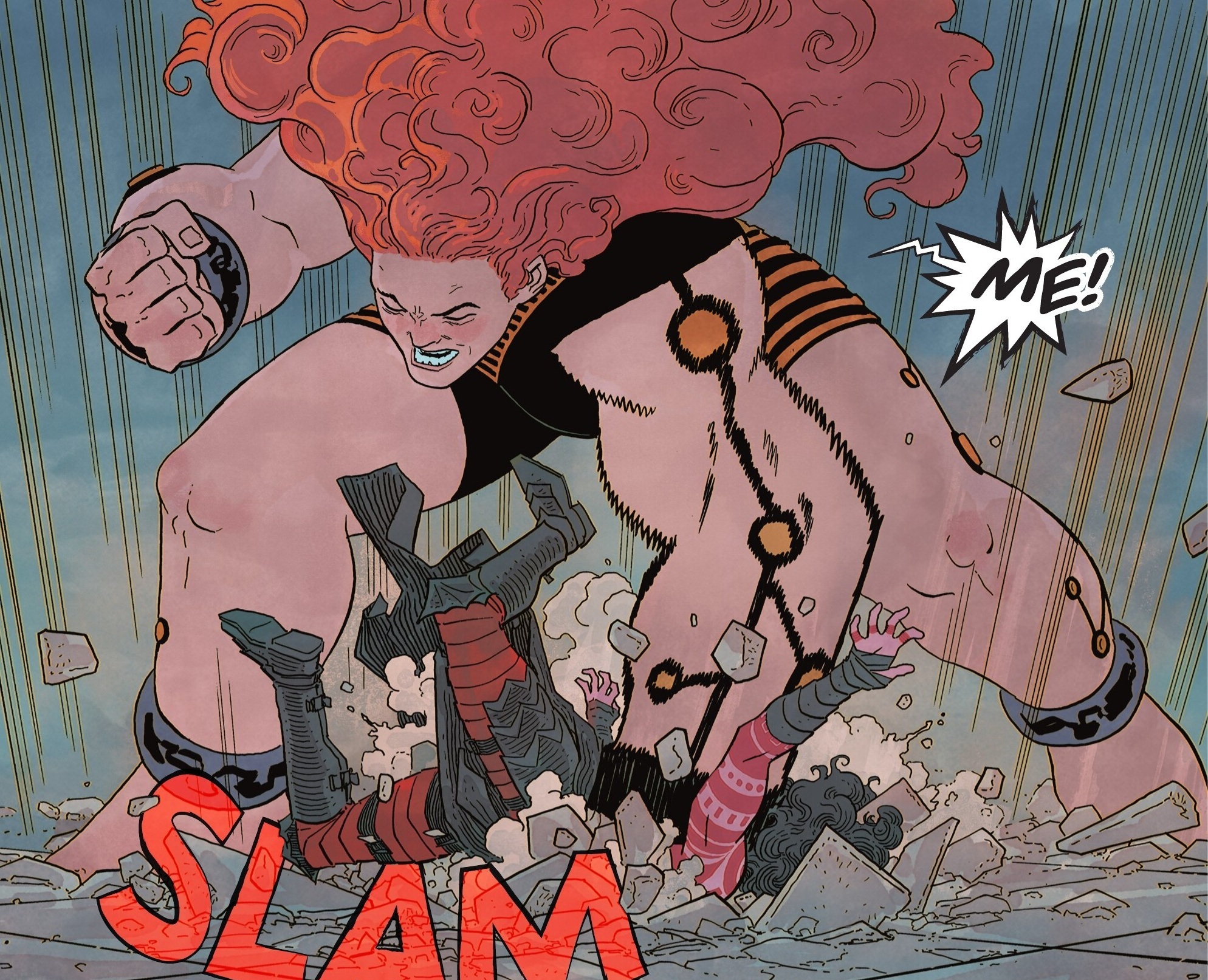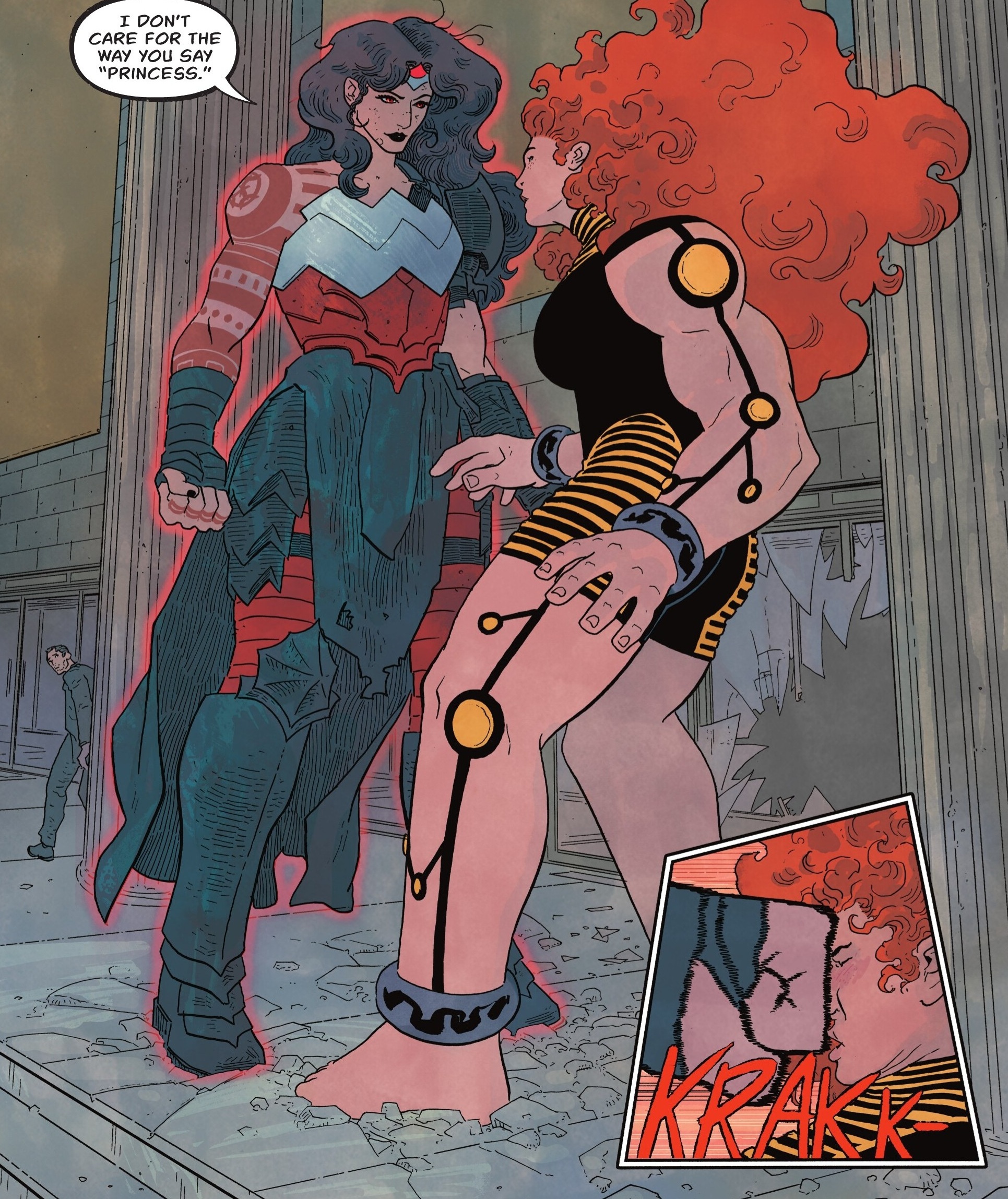 While I’m a little disappointed at how quickly Zatanna disembarks this issue, the fight against classic baddie Giganta more than makes up for the loss. I’m no longtime Wonder Woman fan, but it’s still a hoot to see these classic characters brought into the Absolute Universe. Giganta is fantastic! We don’t get too much depth, but her personality and punch easily drive the issue. And it’s super fun seeing Wonder Woman fight back the way she does. I really like seeing Diana whip out nifty spells in the middle of a fight; it’s a nice addition to her character. Granted, she often does seem to have the perfect spell for whatever she may encounter, but I don’t care. The spell results in Sherman drawing two giant warriors fighting in the middle of a crowded city street, and the double-page spread is incredible!