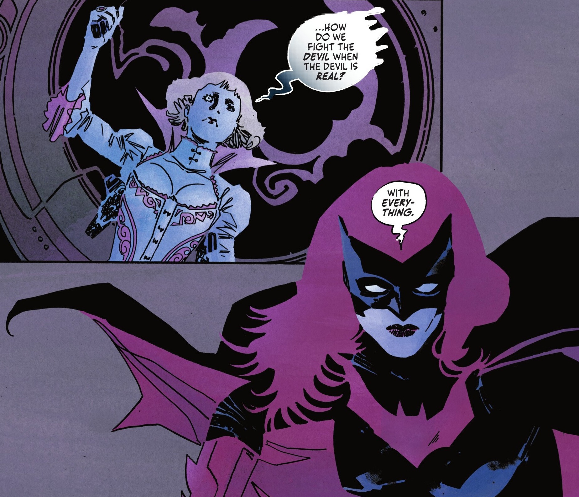 Batwoman is in a mental hospital in Greek after the last encounter with her sister, Alice, when they got into a big fight that didn’t end well. She’s struggling to recover mentally and physically. Meanwhile, some bad guys from the Church of Cain/Darkseid find out that Batwoman is on the island and they want to go get her, but then Batwoman shows up outside their window to deliver a threat.