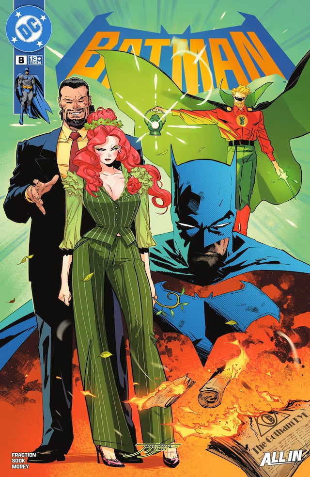 The issue splits between three different stories. In one, Batman consults Green Lantern Alan Scott for how to deal with Vandal Savage. They get coffee in a very visible cafe, because Batman wants to be seen. In another, the newly elected Gotham City Mayor Poison Ivy (??) meets with Savage about his declared war on Batman. Savage talks her into agreeing. And in the last, the old timey reporter and the kid walk through the streets, with the reporter giving him some life lessons.