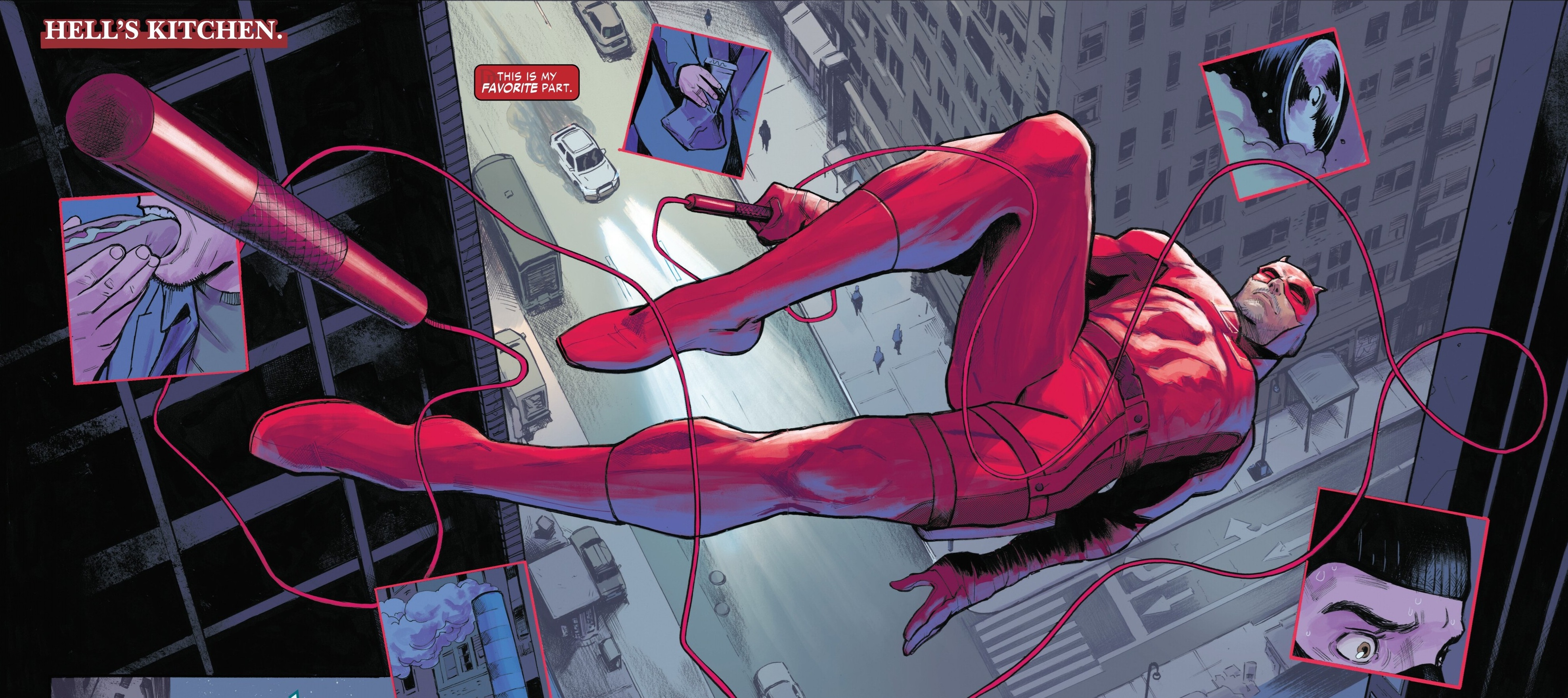 Something I’ve been feeling lately is that superheroes don’t fight crime anymore. It’s something I’ve mostly felt with the likes of Batman and Spider-Man, reading their ongoing comics. It’s always the city at war, or a big space adventure. So I, personally, really enjoyed having Daredevil stop some muggers and some dudes with a stolen car (while totaling the car). That was nice.