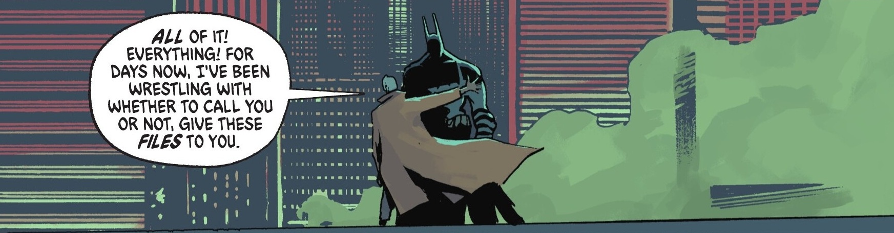 After a very sinister introduction of the Absolute Scarecrow, we check in on Batman going full throttle in Gotham City, trying out new equipment. Batman has become a symbol in the city, which is not what he wanted, and he’s reacting by throwing himself completely into the work, much to Alfred’s chagrin. He’s also working more actively with Harley Quinn and the Red Hood Gang. And when he finally sees a mostly recovered Waylon, who is ready to get back into the action, Bruce turns him down and walks away. He’s not in a good place.