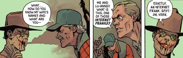 Scarecrow gets a great introduction in this issue, literally stepping out of a cornfield and using whatever weird, spooky powers he has to just ruin the lives of the couple of farmers he comes across. It’s a perfect sort of madness. Then he shows up to kill Jim Gordon and he’s almost just as spooky. We don’t know anything about him yet, but we know he’s real and he’s horrible and that should be pretty awesome.