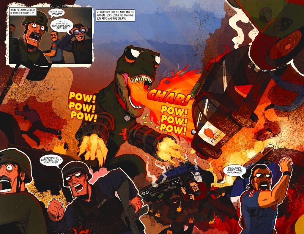 But here is a smidgen of its greatness as Axe Cop and Flute Cop fight dinosaurs in just the first strip!