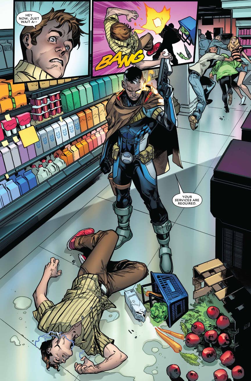For those who aren’t paying attention, Extermination is the final story featuring the time-displaced teen X-Men. That guy up there shooting Mimic is a younger version of Cable, who has traveled back in time to kill people. He’s already killed adult Cable (a character who definitely won’t stay dead for long) and Bloodstorm, that alternate reality Storm who is a vampire, and who has randomly been a part of the teen X-Men comics for awhile. I dunno.